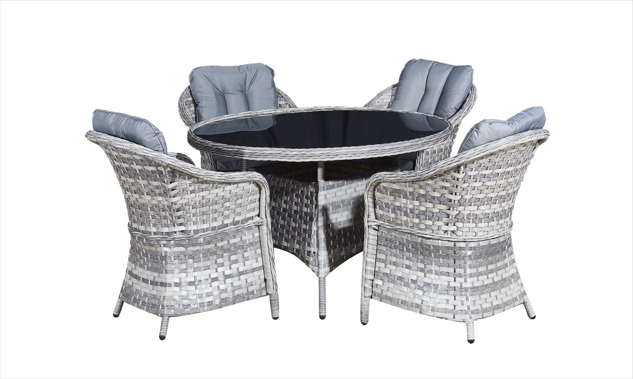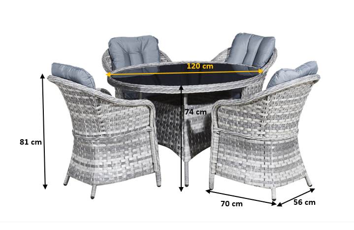 Komplekti kuuluvad istmepadjad ning klaasist lauaplaat. Katted on valmistatud 100% veekindlaks töödeldud polüestrist. Padjakatted on eemaldatavad ning pestavad madalal temperatuuril. Patjade paksus 7cm. Klaasist lauaplaat on valmistatud 5mm paksusest karastatud klaasist.