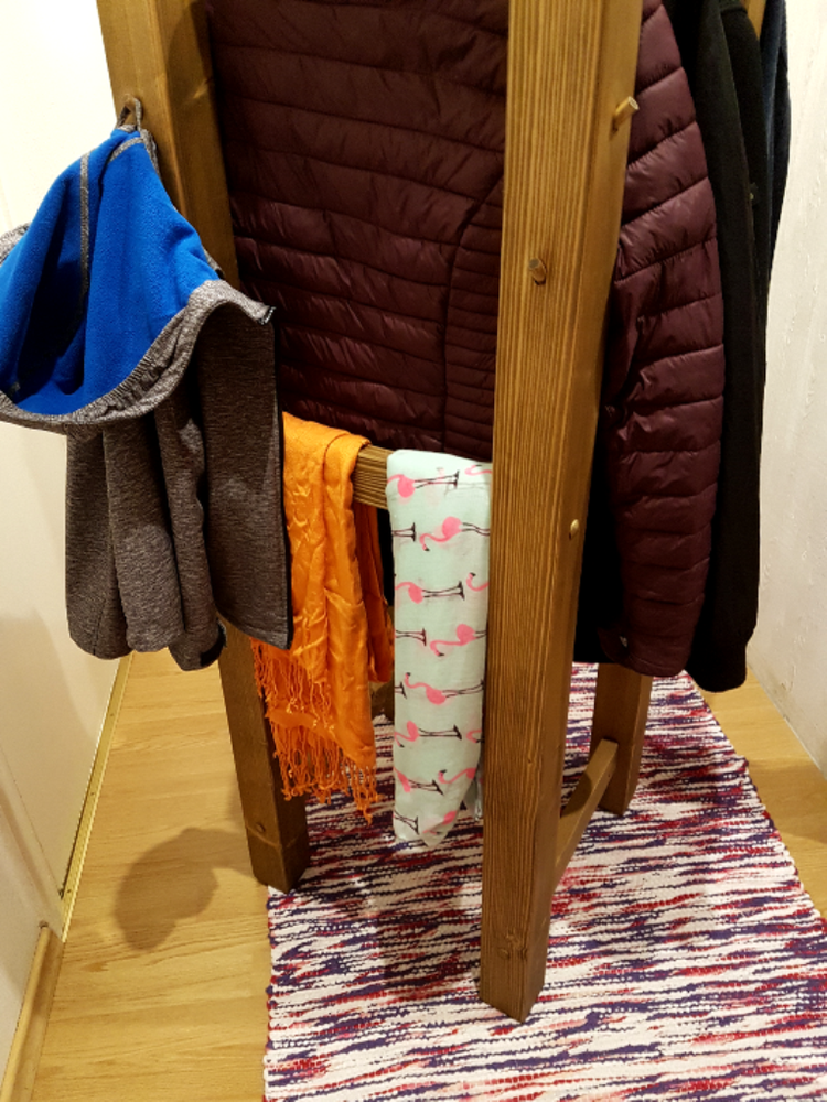 - Külgedel on horisontaalsed postid vihmavarjude ja sallide hoiustamiseks.