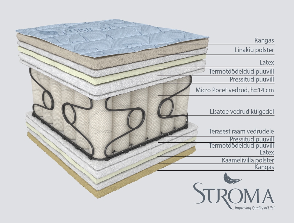 • Micropocket (taskustatud tüüpi) vedrublokk, vedrutraadi läbimõõt 1,30 mm, 545 vedru/m2 kohta, vedrud ühendatud lameda terastraadist raamiga