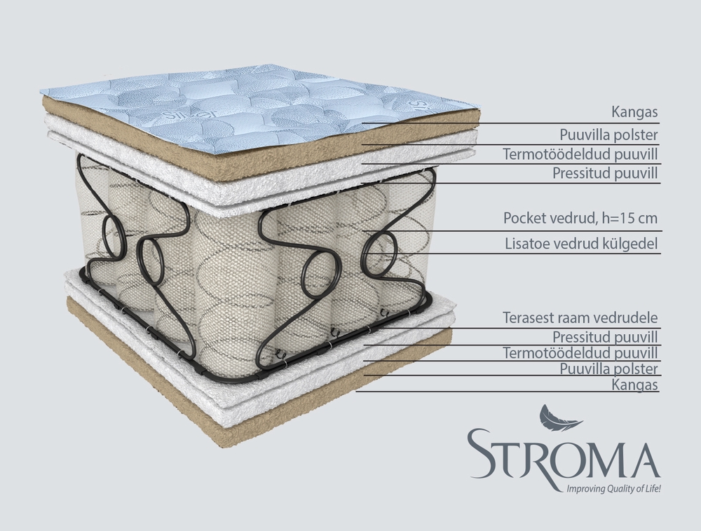 Pocket (taskustatud tüüpi) vedrublokk, vedru traadiläbimõõt on 1,80 mm ning 245 vedru/m2 kohta, vedrud ühendatud lameda terastraadist raamiga