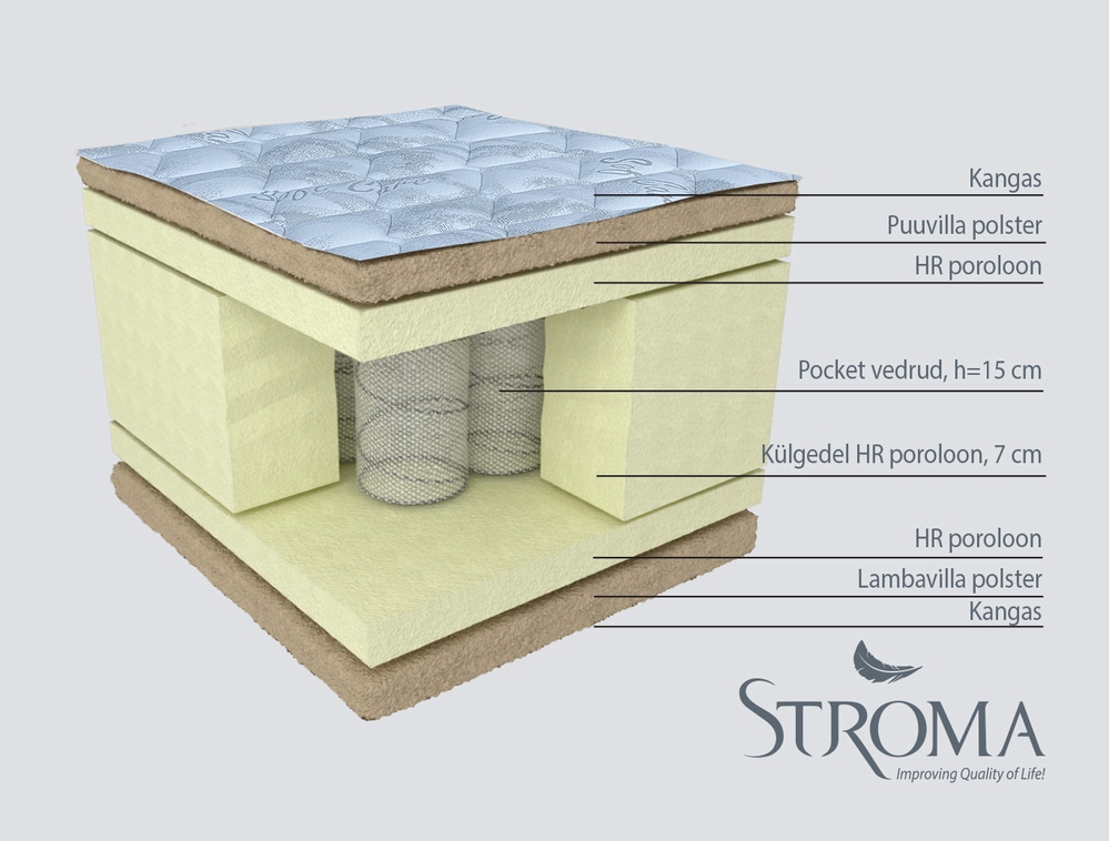 Madrats kaetud Sensovel Viscose kangaga. Viskooskiust valmistatud siidine kangas on antistaatiline, hingav ning niiskust juhtiv pehme kvaliteetne kangas. Kangas vastab Öko-Tex 100 rahvusvahelisele standardile
